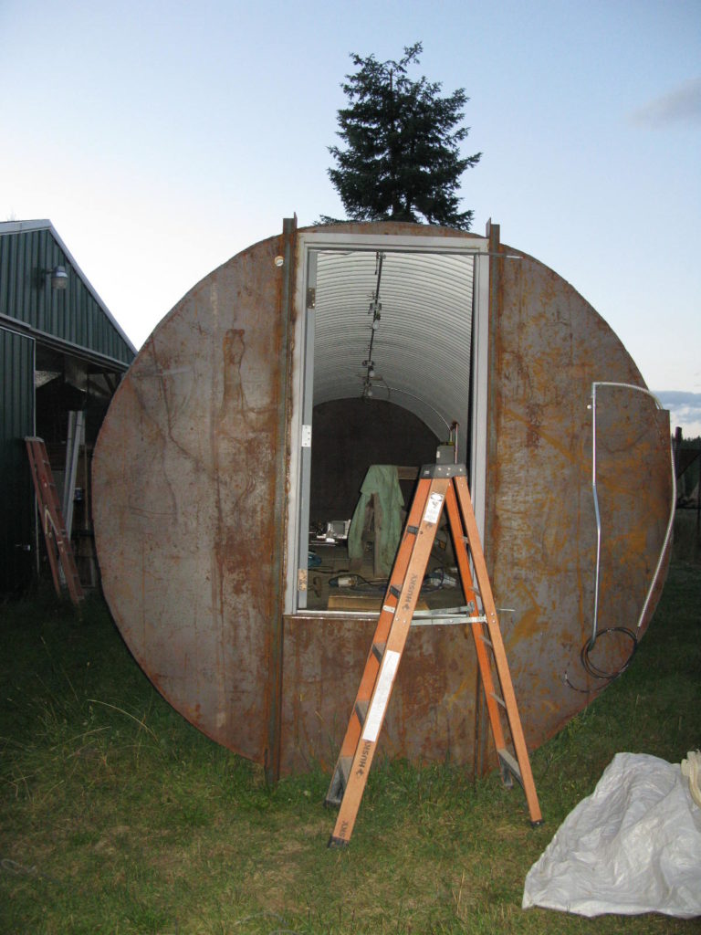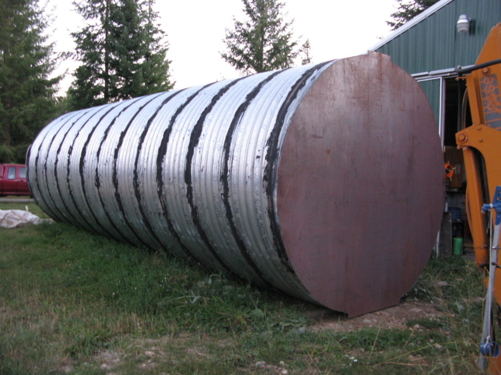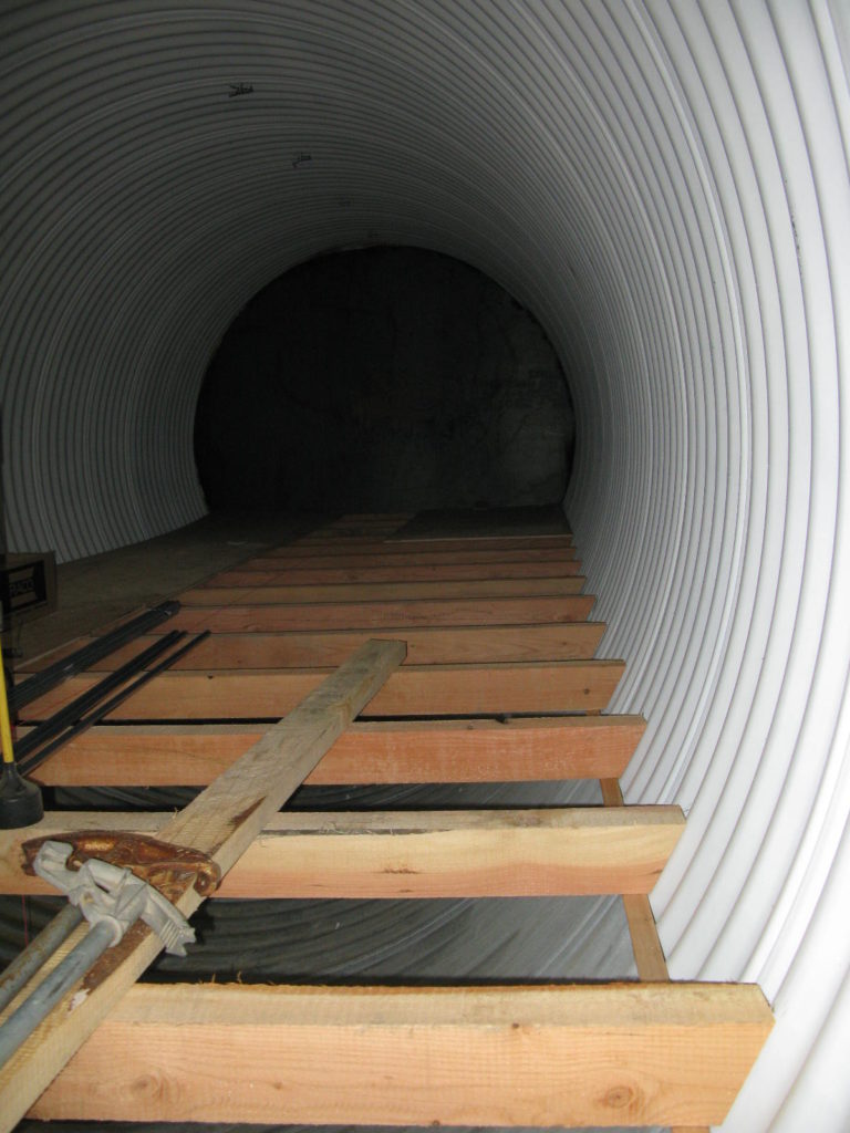 Underground Culvert Shelter. New. Twelve gage corrugated steel culvert, 10 foot diameter by 30 foot long. The ends are capped with 3/16” steel plates with 2 heavy angles at each end to reinforcement the end plates. All welded together. The seams of the culvert have been sealed with tar. The man door is a metal commercial door with a commercial door knob. There is a wood floor installed giving 3 foot of storage under the floor and 7 foot of head-height above. Electrical panel is installed and some wiring done. Comes with a shower stall and precut circular wall panels.
